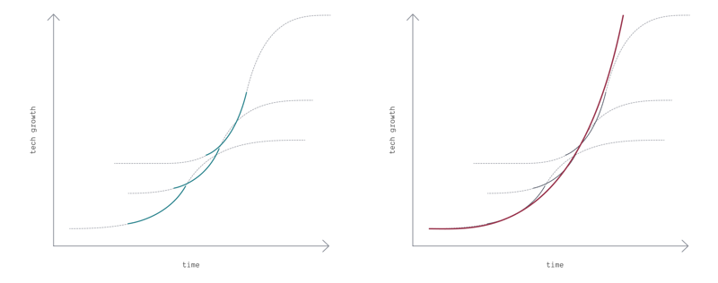 One of the most important lessons I was ever taught by one of my mentors is that true exponentials donât exist. Look hard enough, and theyâre always sigmoid curves. The way you have sustained exponentials over time is by concatenating these S-shaped curves in such a way that you end up with constant acceleration.