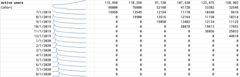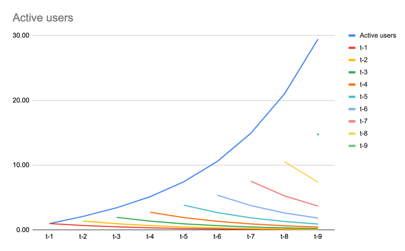What can come to the rescue are user cohorts: all the new users acquired in a specific timeframe will "fade" over time, given a specific rate. Let's keep the previous one: 70% retention.